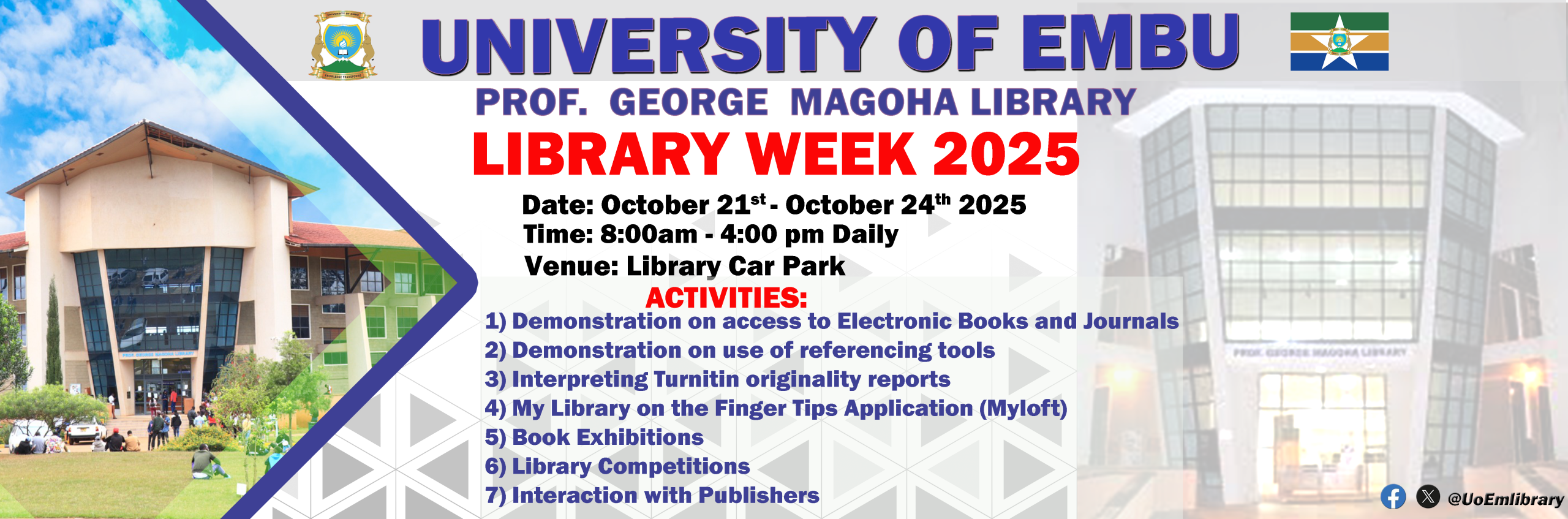 The University of Embu Library, in collaboration with publishers, invites Students and Staff to the Library Week 2025.Dates; 21st -24th October 2025Venue; Library Car ParkTime; 9.00 am to 4.00 pm ActivitiesDemonstration on access to Electronic Books and JournalsDemonstration on use of referencing toolsInterpreting Turnitin originality reportsMy Library on the Finger […]